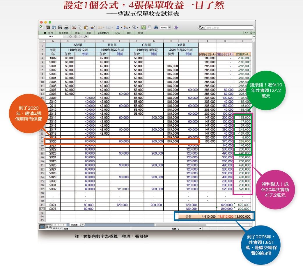 她也發現,總計繳交4百多萬元保費後,創造出1千8百多萬元收益,「這樣說來,我也是隨著時間增加而賺取複利啊!」未來六十年,這些保單更將帶來超過近兩千萬元收益。由於被保人是曹淑玉的女兒,過一段時間後,她打算將女兒改成受益人。透過Excel,讓她發現,這些保單不只保障她的退休生活,未來即便自己不在女兒身邊,女兒也無後顧之憂了。