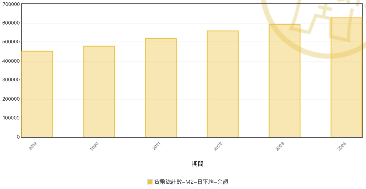 接著來看看貨幣總計數(M2),2020年3倍券發放時,政府一邊撒錢、一邊維持超低利率,已經明顯衝高,M2日平均金額餘額從2019年約4,500億元,穩定增加到2024年超過6,000億元,也就是說,社會上流通的錢比5年前多了3成以上,這些錢最後到哪?