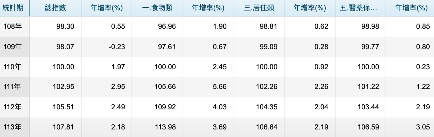 另外是食物類與居住類年增率也超級高,2022年分別達5.66%與2.26%的巔峰,這是最直接影響庶民生活的項目,雖然政府習慣是忽略這些重要的數據,但過去我文章也寫過,這些才是實際上影響我們生活的通膨壓力,但政府卻不願意面對的真相。