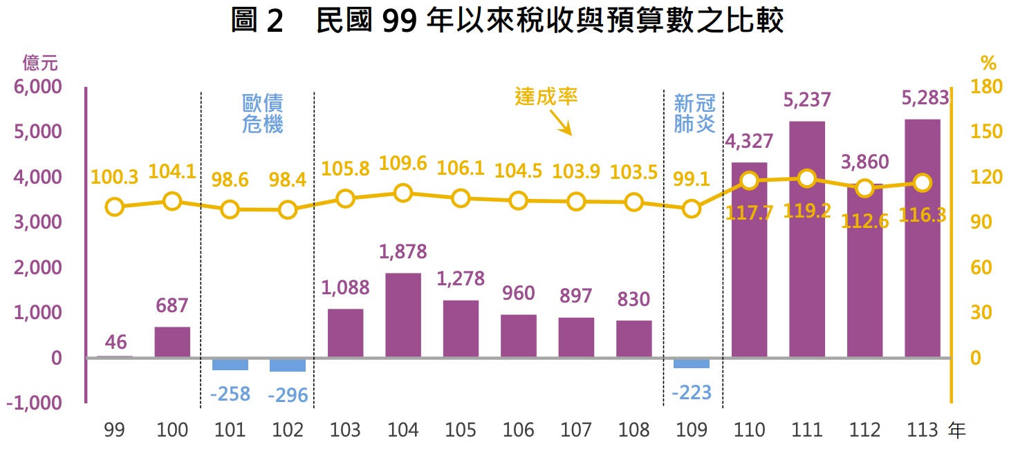 接著來看看財政部稅收達成率,2020年因為疫情而達成99.1%,少賺了223億元,但隔年開始就大爆發,稅金一路飆升,2021年創下5兆2000億元新高,多賺了4,000多億元,接下來直到2024年都一直多賺錢。