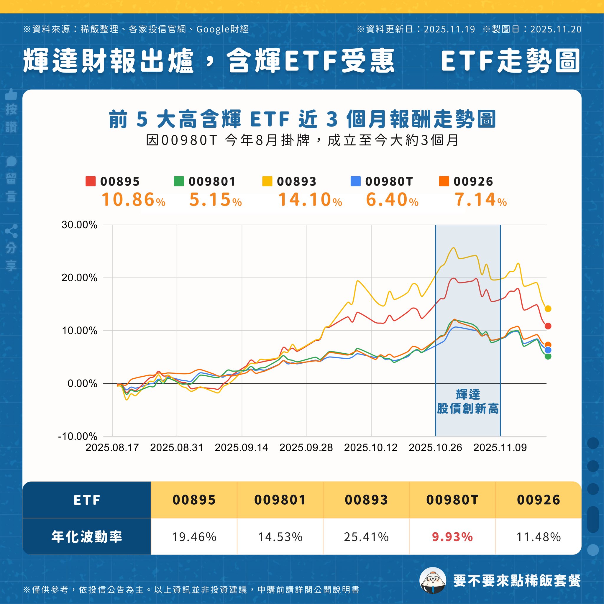 00980T掛牌滿3個多月,所以我拉了近3個月的比較: 00980T:上漲約 7.20%,波動度約 9.93% 00895、00893:波動度約 20% 左右,光看這個差異就很有感。