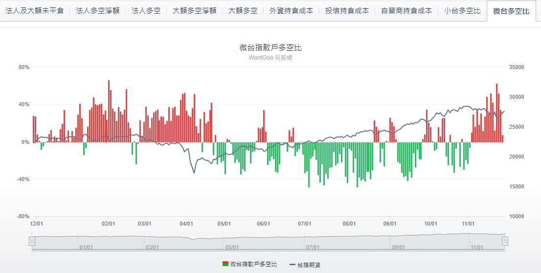 雖然上週指數回檔讓融資短暫下降,但本週又迅速回升,意味著散戶情緒依舊樂觀、此外今年以來微台散戶多空比一直跟指數呈現反向變動,讓12月出現與統計相反的行情機率上升,投資人也該隨時留意風險,避免過度追高股市。