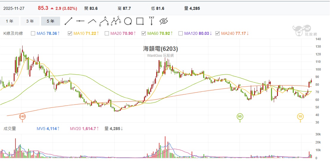 但2024年由於PC市場需求低迷,以及上半年遭遇一段去庫存壓力,雖然高瓦數電源是趨勢,但其在海韻電整體營收中的佔比仍低,使股價開始下跌,直至2025年隨著海韻電AI比重開始提升,輝達RTX 50系列GPU供貨放量,股價再次贏來轉機。
