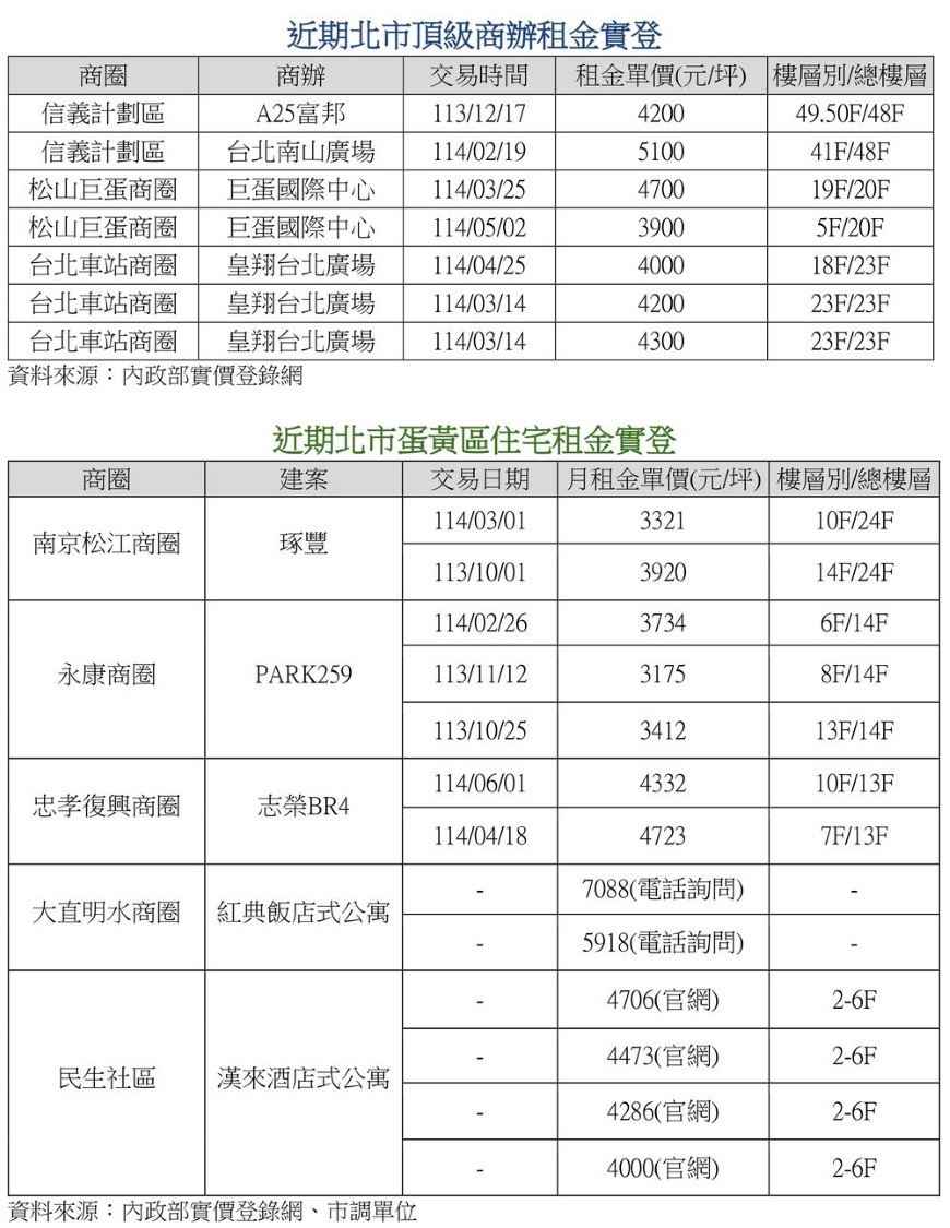 根據市調單位觀察,今年以來頂辦市場出現一波高價租賃潮,包括「南山廣場」租金單價屢破5000元、「A25富邦人壽」預租價格亦站穩4200元,甚至有跨國企業以長年租約包下8層樓、估計總租金高達42.5億元;信義計劃區外圍的「巨蛋國際中心」出現4700元租金單價,台北車站商圈的「皇翔台北廣場」也出現4200~4300元的交易紀錄。