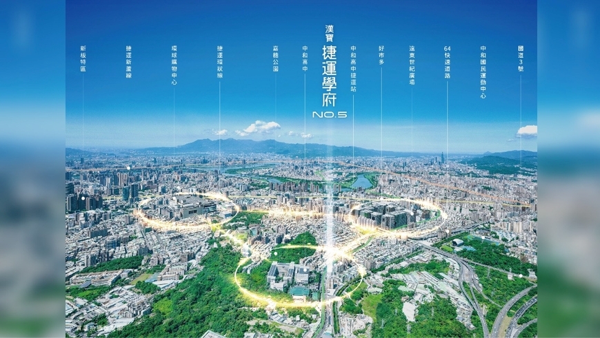 在交通路網的部份,「漢寶捷運學府NO.5」基地所在的萬大線中和高中站LG08站,通車後14分鐘直達中正紀念堂站,快速轉乘淡水信義線、松山新店線到台北市心各大商圈、9站達台北雙星銜接機捷國門。同時擁有3分鐘上北二高中和交流道,6分鐘進入台64線的交通優勢。
