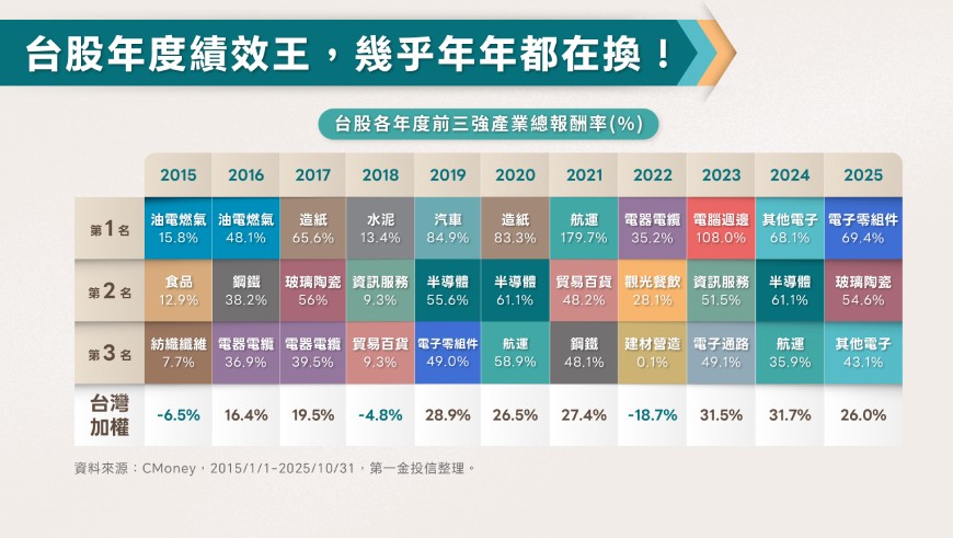 台灣雖然有科技島的美譽,但科技股並非台股永遠的贏家!觀察2015年至2025年、近10年的台股表現,可發現科技股並非年年拿冠軍,而且每年績效王也不太一樣。2015年、2016年由油電燃氣業連2年封王,之後由造紙、水泥、汽車、航運等產業稱霸,2025年至10月底的績效則由電子零組件領先,隨後有玻璃陶瓷強兵追趕。倘若進一步放大觀察年度績效前三強的產業總報酬,各產業輪漲的現象更加明顯,傳產中的貿易百貨、觀光餐飲等今年雖沒什麼表現,不過,在解封後的2021年、2022年都曾飆出好表現。