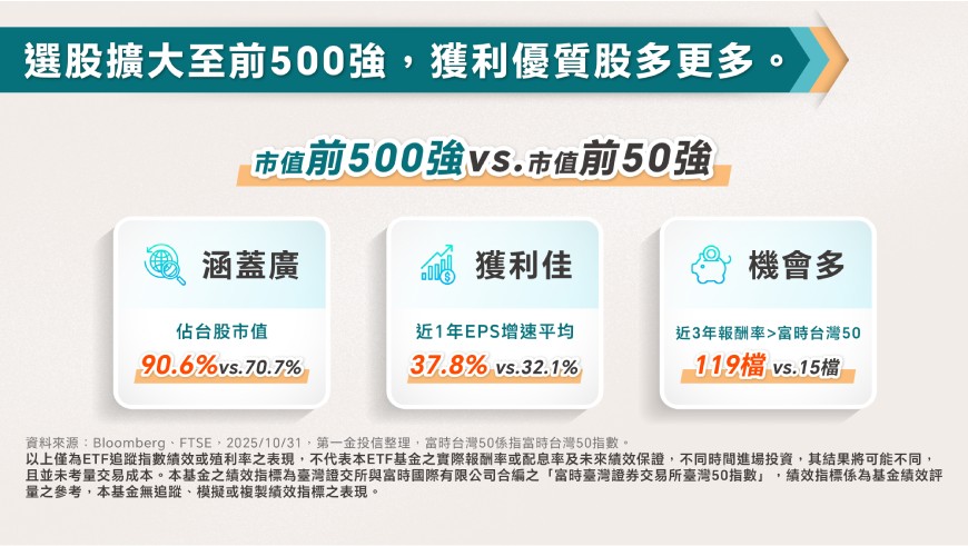 1. 將投資範圍擴大至市值前500大企業。囊括大型、中型、高股息、成長等標的。相較於傳統市值選股出股出發的50大企業,涵蓋台股總市值範圍從70.7%提升至90.6%,不僅更具代表性,也提供更多投資機會。近三年表現超越富時台灣50指數的個股中,前500大企業有119檔,而前50大僅有15檔,投資機會多連帶報酬潛力更高。至於股票池則每季調整,以掌握最新產業趨勢。