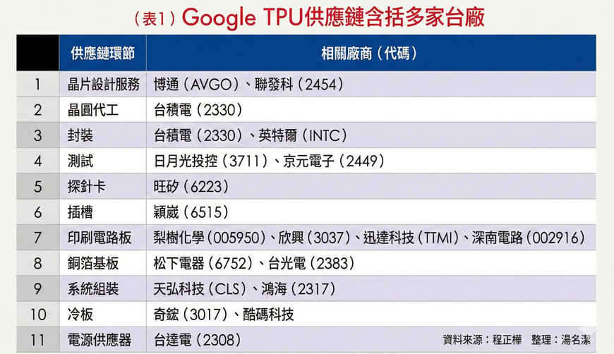 目前最受矚目的AI巨擘當屬Google,其開發的TPU(Tensor Processing Unit,張量處理器)因運算效率更高,被視為足可挑戰由輝達(NVIDIA)GPU(Graphics Processing Unit,圖形處理器)長期稱霸的AI晶片市場。環繞TPU的台灣供應商,如台積電(2330)、聯發科(2454)、日月光控股(3711)、鴻海(2317)因此被市場點名看好(詳見表1)。