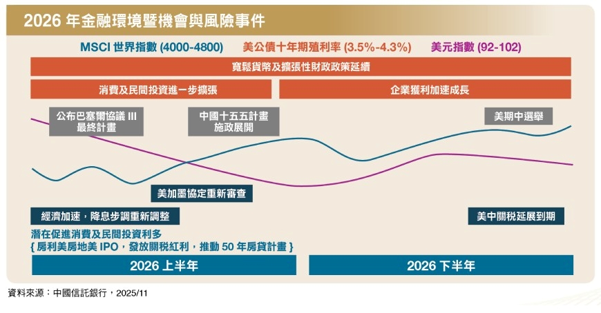 展望2026年,中國信託銀行認為,儘管2026年初預期將受到2025年遺留的雜音如利率決策、經濟數據疲軟、AI估值疑慮、關稅判決等干擾,但是,全球經濟可望延續溫和成長步調,股債市場表現有望延續,因為寬鬆貨幣政策的傳導效果將逐步顯現,通膨趨穩亦為各國財政擴張提供更大空間。另一方面,AI算力競賽仍在加速,企業資本支出維持高速成長,電力與儲能產能吃緊,AI應用持續向各產業滲透,有望進一步推升製造循環的復甦力道。