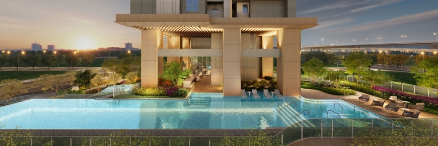「遠雄丰尚」1,117坪基地,採純住宅設計、零店面配置、低建蔽率規劃,強調居住私密與品質,建案二樓規劃9米挑高複層式露臺,結合無邊際泳池,打造宛如度假飯店般的生活場景。建築臨路退縮30米,打造開闊前庭尺度,住戶穿越千坪四季景觀庭院回家,保有與城市喧囂的距離感。