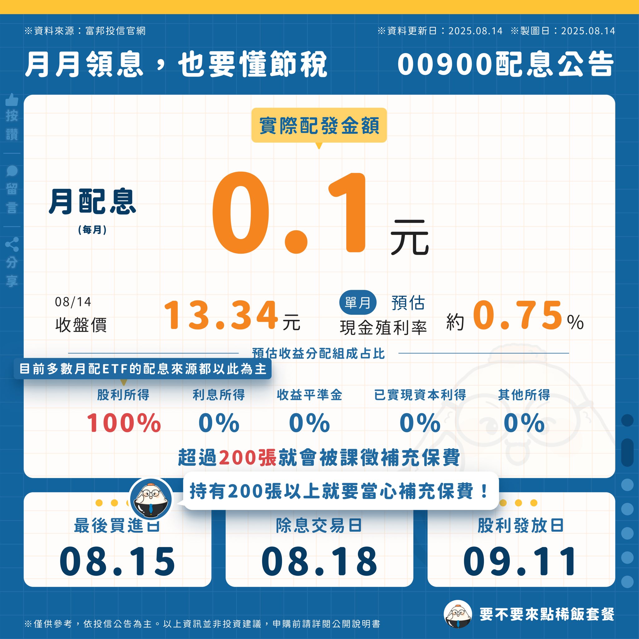 不過,領息領得多了,稅務問題也要開始注意。舉例來說,以富邦特選高股息30(00900)這檔高股息ETF來看,7月每單位配發0.1元,換算下來,若你持有200張,就能月領約2萬元,一年下來就是24萬元。