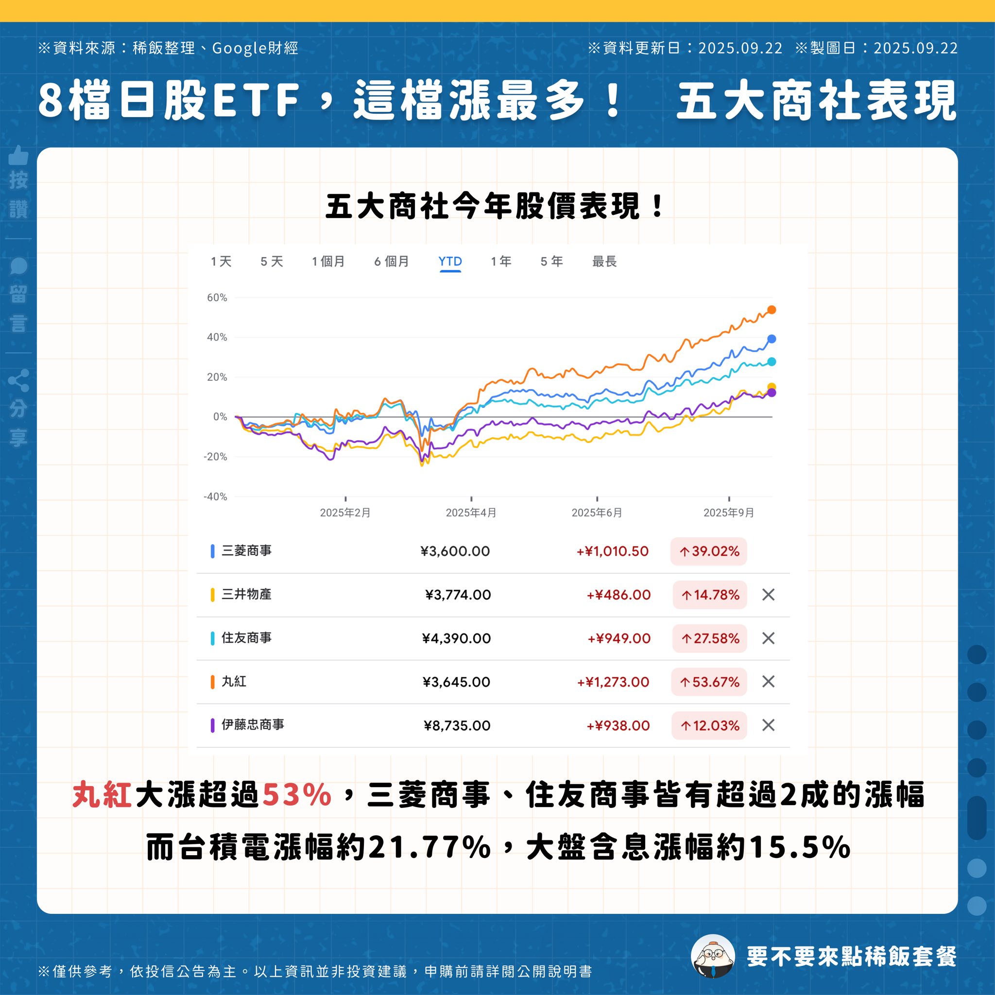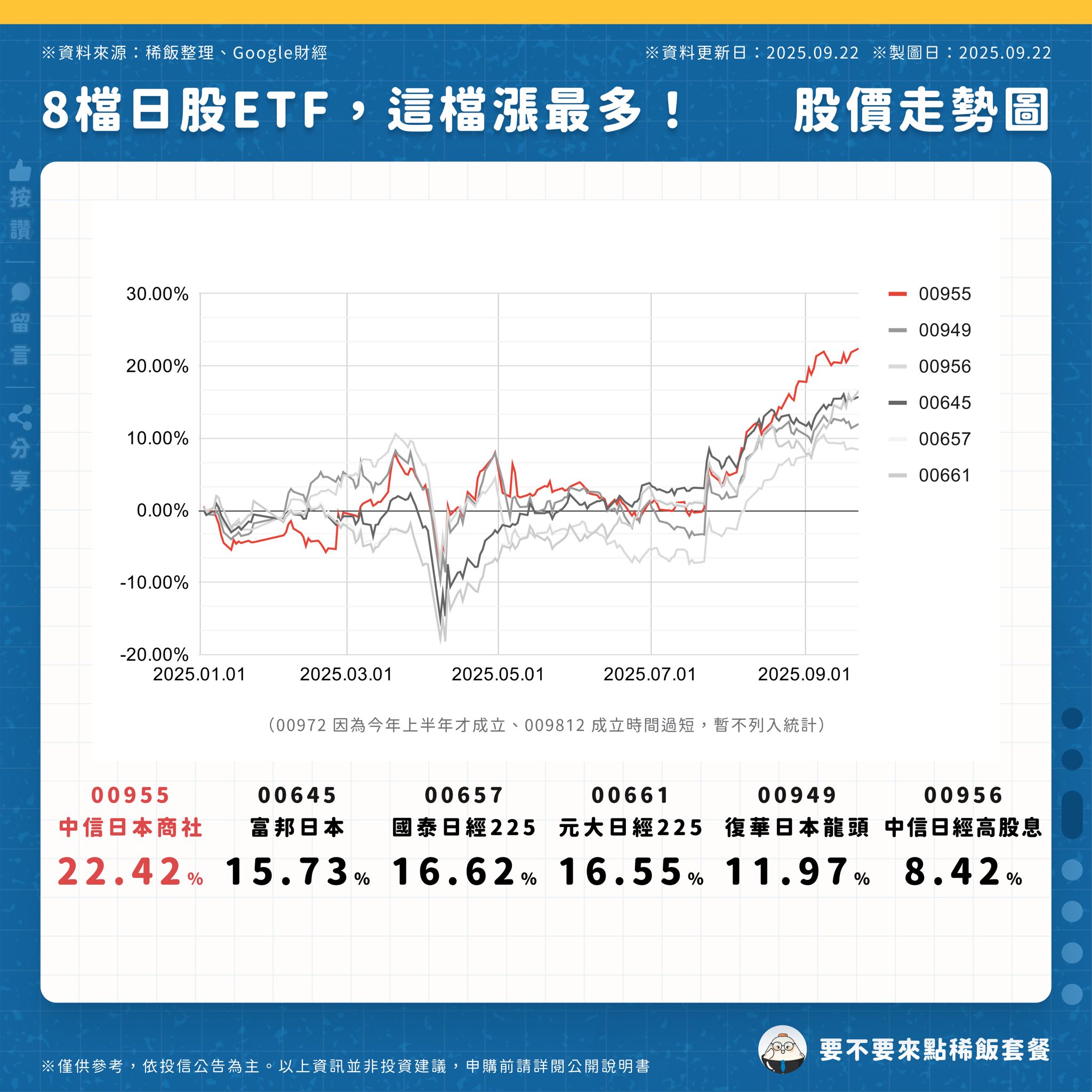 如果你看好日本大盤,就能選擇追蹤日經225或東證指數的ETF;若想押注特定產業或企業,商社題材的00955或龍頭股導向的00949會更適合。