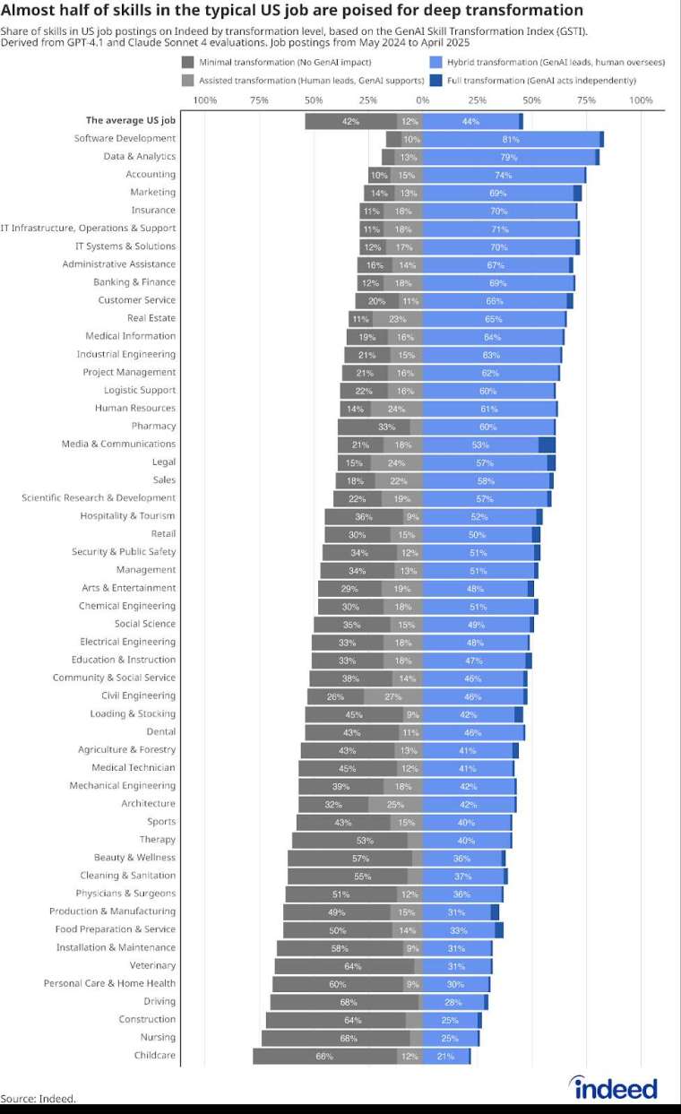 求職平台Indeed最新研究顯示,生成式AI正大幅改變職場生態,41%的工作技能面臨高度轉型,軟體開發是最容易被AI改變的職業,而育兒、護理等需要人際互動的工作受影響最小。