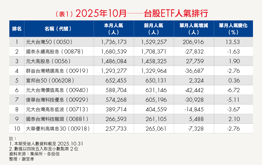 不過本月最重要的是,市值型ETF之王的元大台灣50(0050),人氣(受益人數)不只延續上個月的驚人成長,更直接刷新自身過去單月成長逾10萬的最高紀錄——本次單月人氣成長突破20萬人(20萬6,916人、13.53%),人氣總數以173萬6,173人更是直接超車國泰永續高股息(00878)的168萬539人,成為新一代的ETF人氣王,同時也終止了00878過去長達32個月的人氣王蟬聯紀錄(2023年2月~2025年9月)。