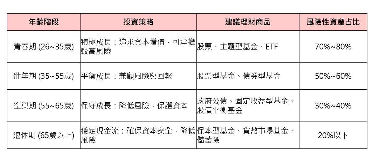 • 退休前應逐步轉向低風險資產,確保穩定收益