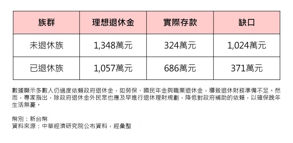 根據中華經濟研究院2024年調查,台灣民眾的退休金準備普遍不足,與理想中的退休金目標存在顯著落差。