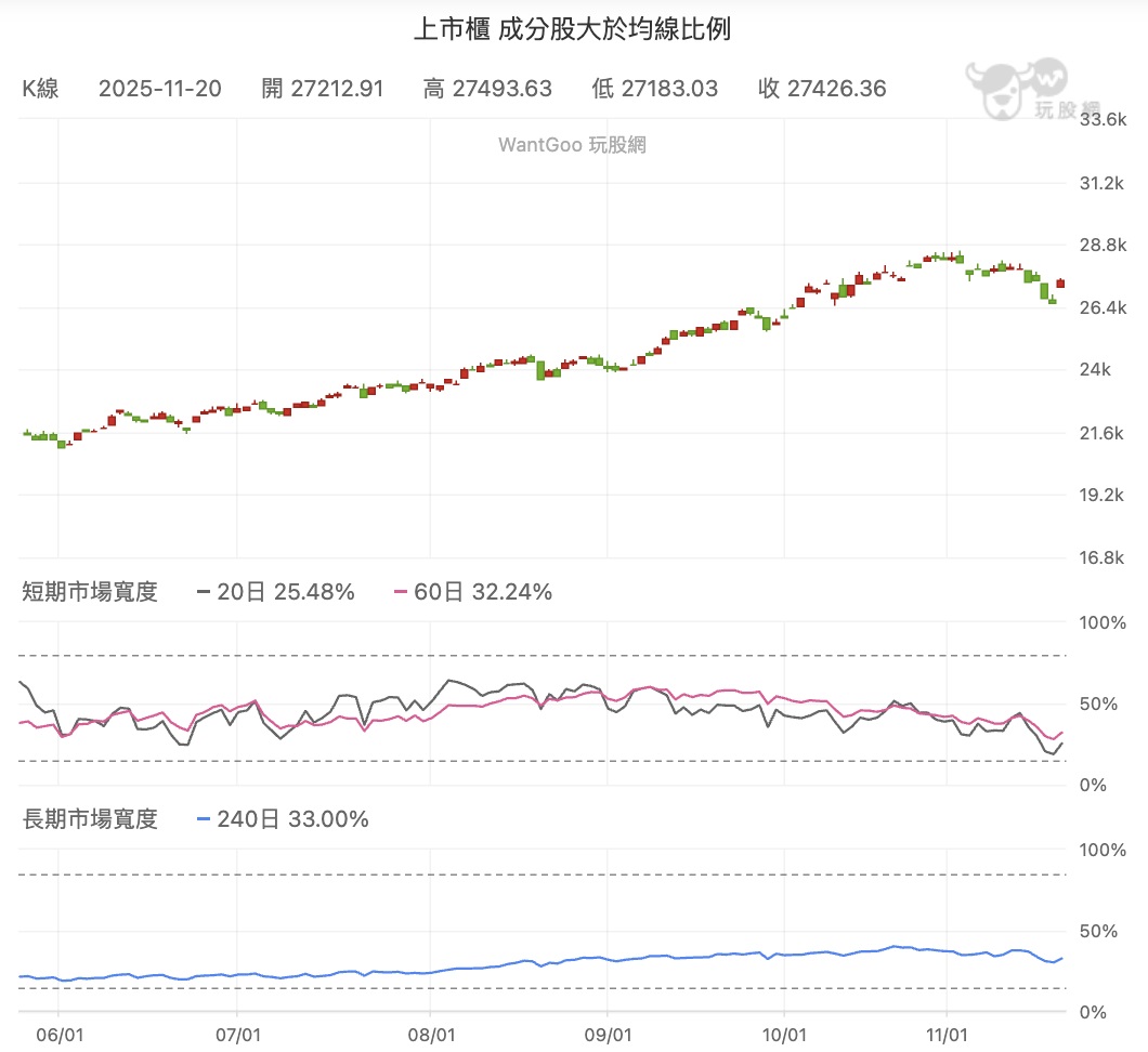 玩股網看市場寬度就很明顯,現在長天期市場寬度是33%,代表只有33%的股票是站在年線之上,而站在月線上的股票是25%,站在季線上的股票是32%,大多數股票是短線中線長線都很弱勢,依然是分化嚴重。