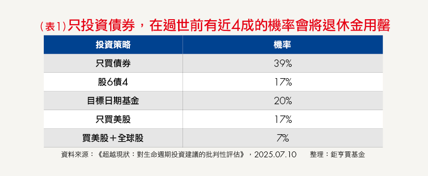 根據2025年出爐的最新研究《超愈現狀:對生命週期投資建議的批判性評估》(Beyond the Status Quo: A Critical Assessment of Lifecycle Investment Advice),在100萬種退休情境中,以債券為主的配置,有高達39%的人可能在過世前就用光資產;「股6債4」的配置策略、或購入目標日期基金(Target Date Fund)也有約2成機率到最後會出現資金不足的窘境(詳見表1)。
