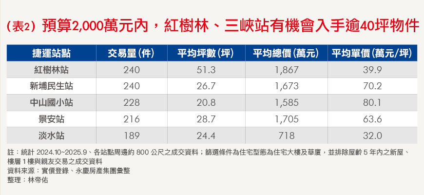 若總價提升至2,000萬元,紅樹林站、新埔民生站、中山國小站、景安站、淡水站則為交易最活躍的前5大站點。過去1年,紅樹林站的單價相對親民,平均購屋坪數達51.3坪(詳見表2)。