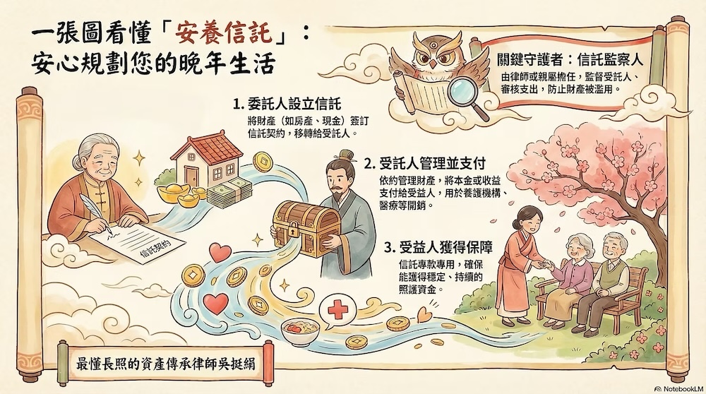 透過信託契約,這筆錢就能依約定,定期支付生活費、看護費,甚至是未來入住養生村或安養機構的費用。