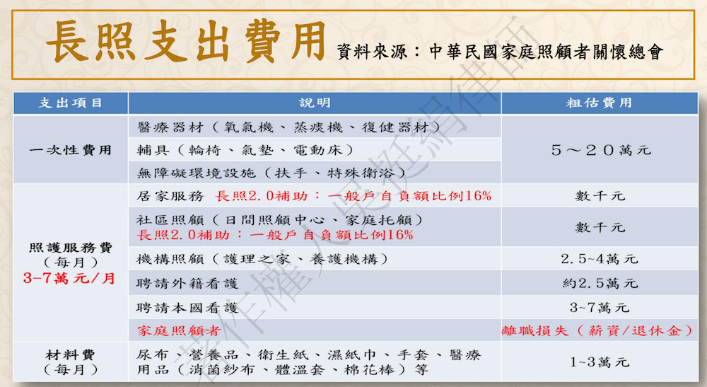 除了看護或機構的定期每月照護開銷費,另外一次性的高額支出(如輪椅、電動床等輔具,或家中無障礙設施改造,花費約在5萬元~20萬元),以及每月的固定材料費(如尿布、營養品、醫療用品等,約需1萬元~3萬元)。