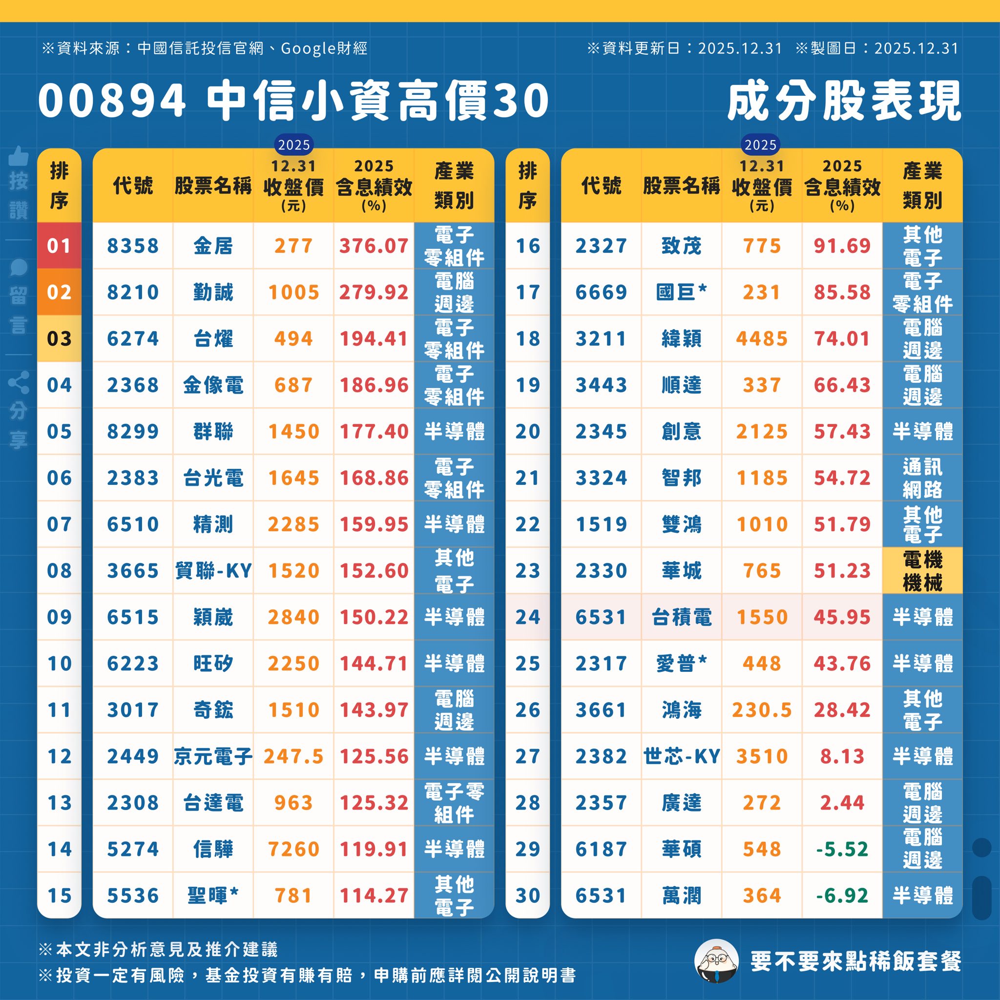 我假日特地把00894的成分股拉出來統計了一下,30檔成分股裡,2025年度漲幅超過100%的就有15檔。反而大家最熟悉的台積電,全年上漲約45.95%,在這檔ETF裡只能排到第24名,算是相對後段班。