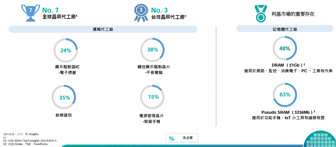力積電是晶圓代工廠,同時也是記憶體代工廠。代工的記憶體產品除了DRAM之外,還包括PSRAM。目前力積電營收有6成來自電源管理IC、MCU、顯示晶片以及影像感測器等邏輯IC產品,剩下4成來自利基型記憶體產品。