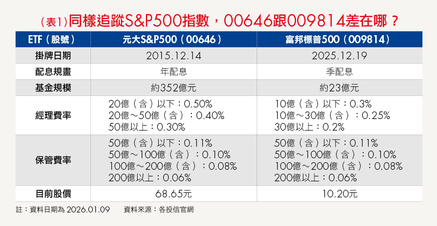 截至2026年1月9日,00646的基金規模約為352億元,適用的經理費率、保管費率都是最低級距,合計為0.36%;而009814基金規模約23億元,目前適用的費用率加計也是0.36%(詳見表1)。