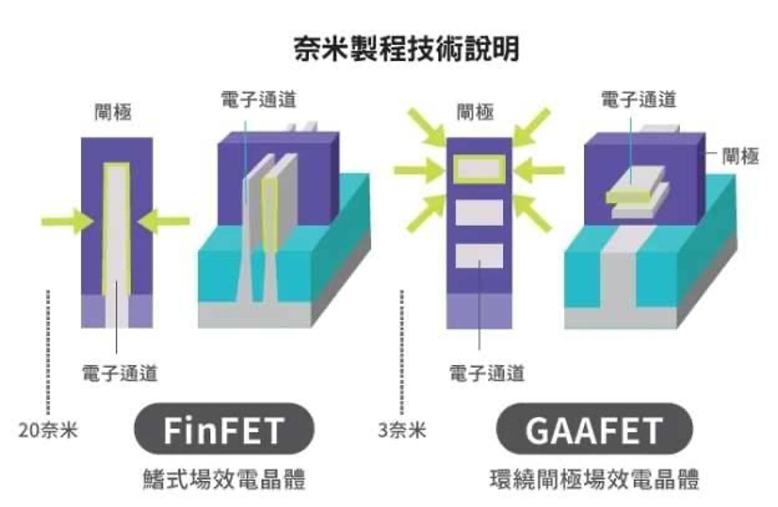 在電晶體結構演進上,台積電3奈米仍延續自22奈米世代以來的FinFET(鰭式場效電晶體)架構,而2奈米則正式導入第一代Nanosheet,完成一次關鍵性的世代交替。