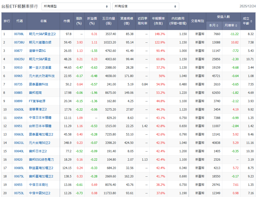 期元大S&P黃金正2(00708L):年報酬率高達148.3%。