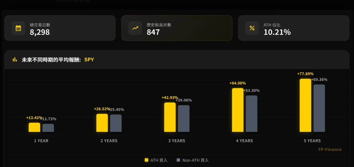 做法其實很簡單:把過去每一天分成「歷史新高日」與「非新高日」,分別模擬如果你在這2種日子買進,持有1年~5年後的報酬表現。