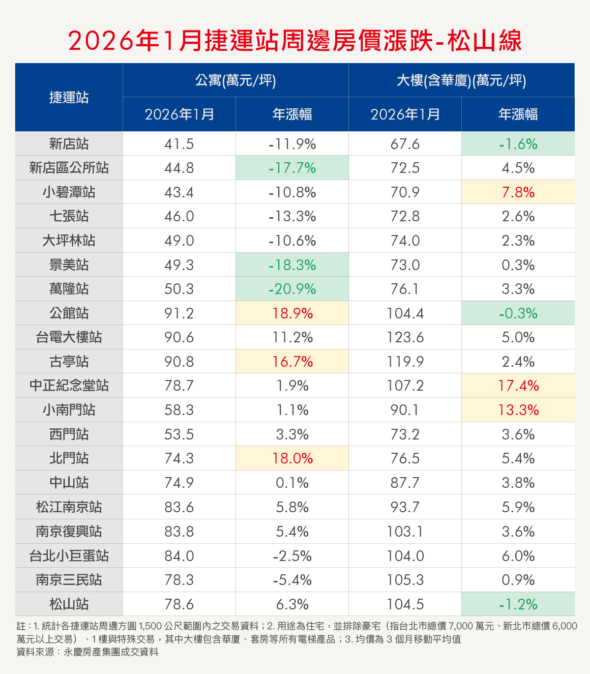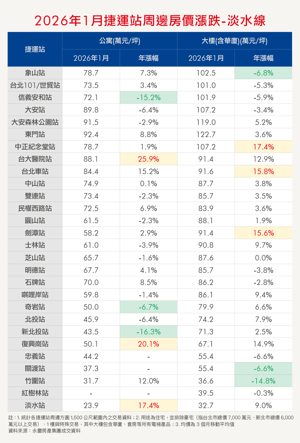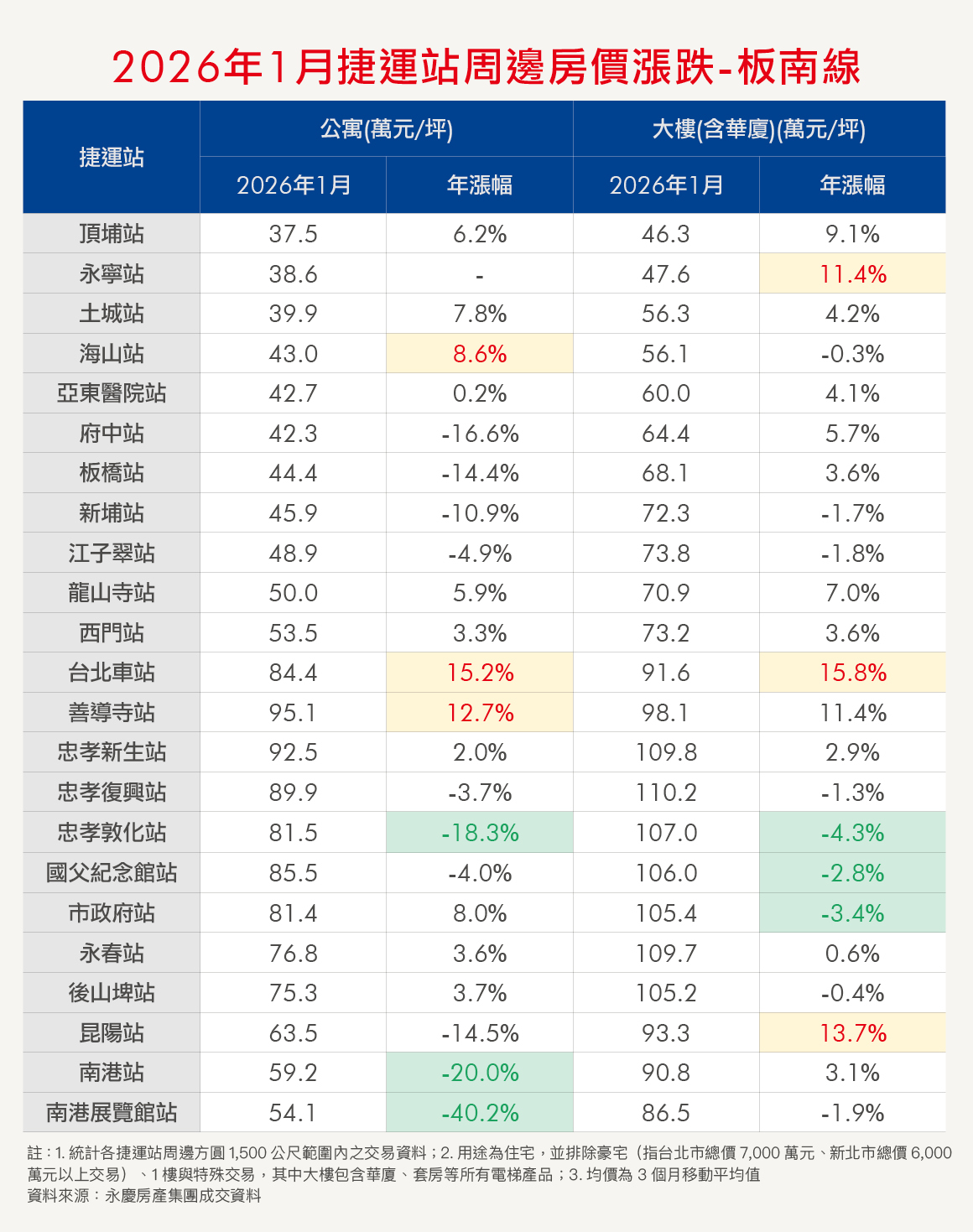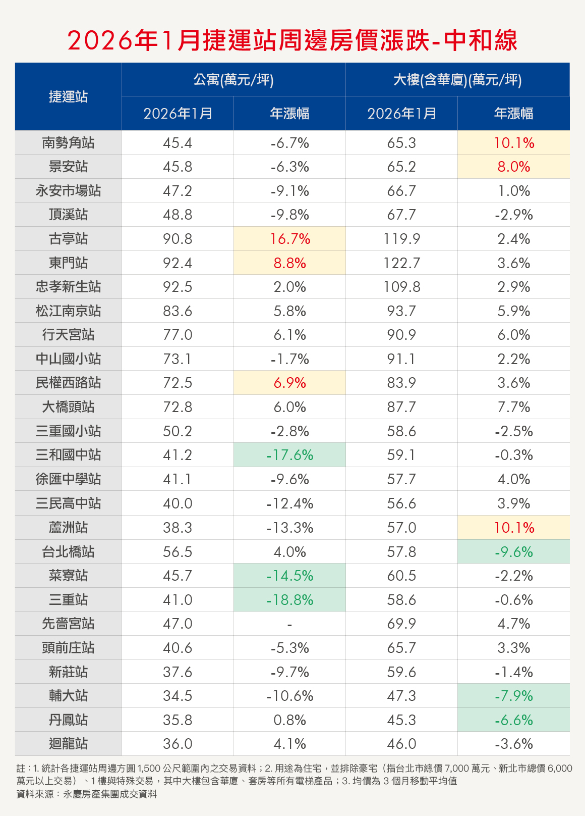 入住捷運宅,是不少人的購屋目標。為讓消費者有第一手訊息,《Smart智富》與永慶房產集團合作,每個月彙整各捷運站點周邊的公寓、大樓房價,並計算年增率。本月統計2025年11月至2026年1月的均價。