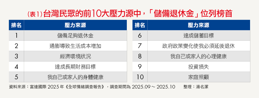 你比較擔心眼下物價上漲,還是未來錢不夠用?一項針對台灣民眾的調查報告顯示,2024年時,「通膨推升生活成本」高居壓力排行榜之首,但到了去(2025)年下旬,最多人擔心的事已變成「退休儲蓄是否足夠」(詳見表1)。這個轉變,意味著國人的焦慮源頭,正從短期的物價波動,移向更長期的財務安全。