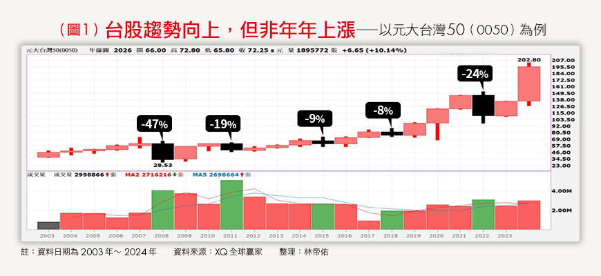 不過,理論終究是理論,實際的投資情況又會是如何呢?以0050來看,股價長期確實由左下往右上,但0050自2003年掛牌以來,並不是一路成長,中間經過了許多波動,譬如2008年下跌47%、2011年下跌19%、2022年下跌24%(詳見圖1)。