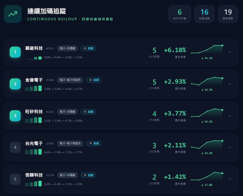 近期主動式ETF成為市場焦點,透過關注經理人加速建倉動向,可掌握潛力題材股,最近法人明顯增持穎崴、金像電、旺矽、台光電與信驊,反映AI產業需求強勁與基本面支撐。