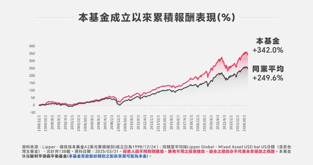 駿利亨德森平衡策略採用35%-70%股票與30%-65%固定收益的動態配置策略,可根據市場狀況調整資產配置比重,累積超過25年的實力(詳參下圖),走過科技泡沫、金融海嘯的考驗,顯示其面對極端市場的韌性,是駕馭波動,長期核心的優質選擇。