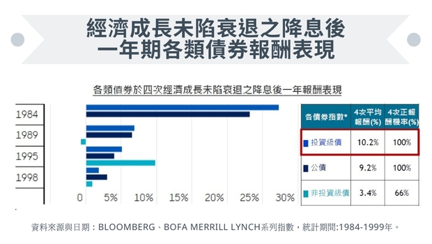 富邦投信固定收益投資部主管薛博升表示,降息使債市普遍受惠,若進一步觀察1984年、1989年、1995年及1998年四個經濟並未衰退的降息情境,統計降息後一年可見投資等級企業債券的表現平均為10.2%,優於政府公債的9.2%。而信用評級較低的非投資級債因為對經濟放緩的敏感度較高,因此過往好壞參雜,平均四個期間的報酬與勝率便稍稍低於投資級債及公債類資產(*)。