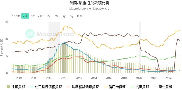 不過雖然現今的政策方向看起來仍舊穩健,但2026年還是有不少變數。首先,川普不斷以政治力干預Fed,希望Fed能更加寬鬆,目前新任主席很有可能會選出激進鴿派的哈塞特。其實這也毫不令人意外,因為無論是從SOFR利率、貸款拖欠比率、非農就業數據來看,都可以看到美國的經濟確實是有遇到一定的下行壓力,而且從選舉角度思考,川普明年中還有期中大選,更寬鬆的政策才符合他的利益。