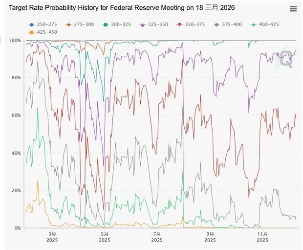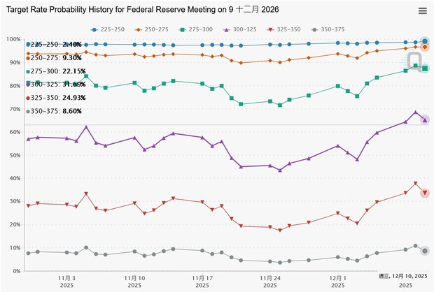 那2026年的利率走勢到底該如何判斷呢,首先我們從本次會議公布的利率點陣圖來看,利率持平在現今水準、降1碼、降2碼的得票數都是3票,顯示Fed官員內部對於趨勢的看法並不十分統一,而目前利率期貨市場也是反映這樣的結果。