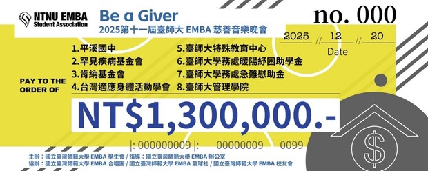 在歌聲與音樂的陪伴中,慈善音樂會於短短 10 天內募集 130 萬元善款。本屆音樂會全數捐款,將捐贈予 平溪國中、罕見疾病基金會、肯納基金會、台灣適應身體活動學會、臺師大特殊教育中心、臺師大學務處(暖陽紓困助學金與急難慰助金)及臺師大管理學院(弱勢學生助學金),持續支持教育、醫療與關懷相關行動。