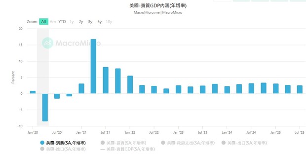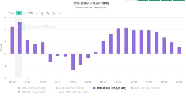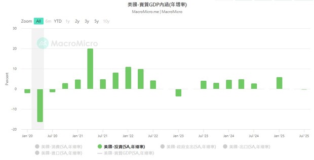 不過儘管消費不突出,若從國家投資(G)及民間投資(I)的驅動力來看,卻可以看到隨著企業、國家對於AI、製造業回流政策的持續投入,美國的經濟正形成一股新興的成長動能。首先以政府支出來看,美國從2023年後一有比較明顯的增長,這部分主要是綠色能源、半導體補貼帶來的政策驅動力。舉例來講,美國透過《晶片與科學法案》在 2024 年密集宣佈並撥付數百億美元的直接補助,宣佈給予三星 64 億美元、給予美光(Micron) 61 億美元等,用於支持本土半導體製造與 AI 先進製程。
