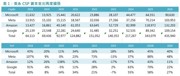 對此,我們也可以看到一些數據上的趨勢,像是從企業(I)的資本支出來看,去年第1季有比較明顯的提升,而伴隨著大量的廠商答應要到美國設廠,預期2026年美國的企業投資應該會更加加速。而若從最新數據觀察,雲端CSP業者在2026年的資本支出仍舊持續大幅增長,預期2026年整體仍會有近30%的增長力道,BCA Research的資料更是提到2025年技術設備與軟件投資已經達到GDP的4.4%,2026年將繼續向上成長。