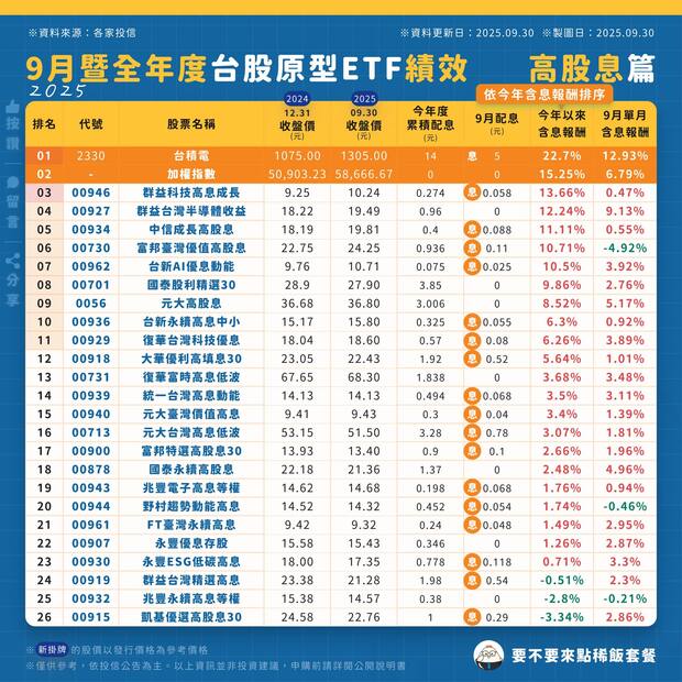 高股息 ETF 9月最新績效榜出爐!竟有一檔單月漲了9%!