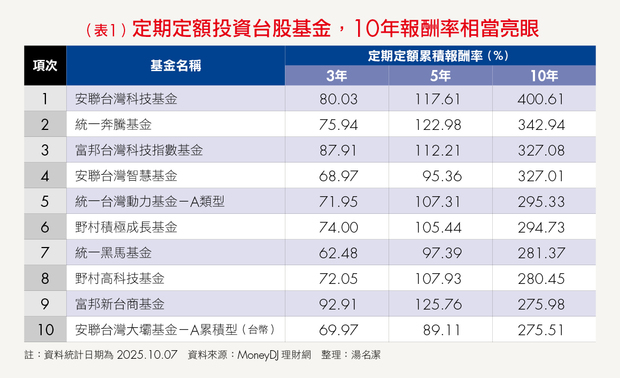 以截至今(2025)年9月底的台灣可銷售基金10年定期定額績效為例,資訊科技股票、台灣股票以及台灣中小型股票基金的平均累積報酬率都超過150%,有些老字號基金的報酬率更高達300%、400%(詳見表1)。雖然這類基金波動度相對較高,但其潛在獲利空間更大,非常適合年輕人累積「第一桶金」。