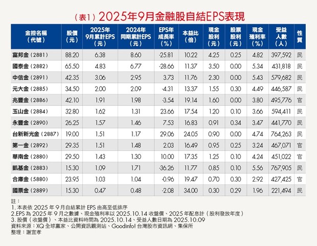 在今年前3季的累計EPS表現上,最賺錢的3大金控毫無懸念地,再度由富邦金、國泰金及中信金所拿下,累計EPS分別為6.38元、4.83元和3.06元。其他金控今年前9月的累計EPS都不到3元。