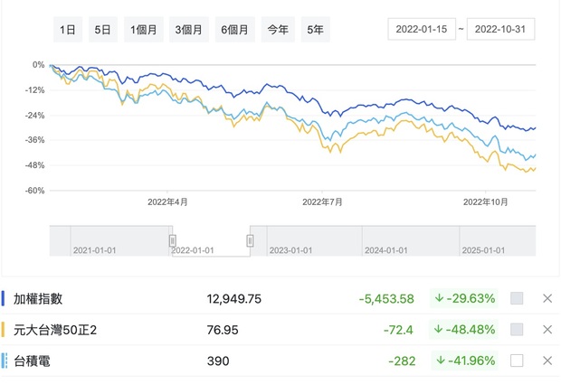 再看2022年的空頭比較(2022.01.15~2022.10.31),會發現台積電跌幅接近正2,0050明顯少一些,畢竟成分股內有電信股跟統一這種相對抗跌的股票。空頭來了,正2比較起來就是跌最慘的。
