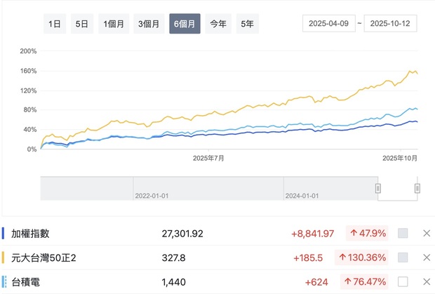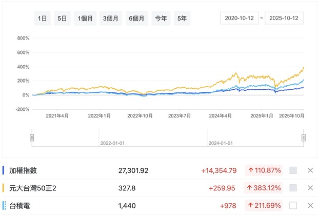 但觀察把時間拉長到近5年(2020.10.12~2025.10.12)台積電漲幅是211%,0050是110%,台積電比0050多1倍,正2的投報率是383%,0050跟台積電都狂輸正2。主要是現在台股正在歷史高點導致的。