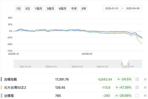 以今年1月1日到4月9日來看,台積電跌幅與0050差不多,但正2跌幅幾乎是翻倍。單押台積電漲跌幅通常小於正2,所以你的正2部位,在4月大跌後依然健在,改買台積電也不會讓你壓力太大。