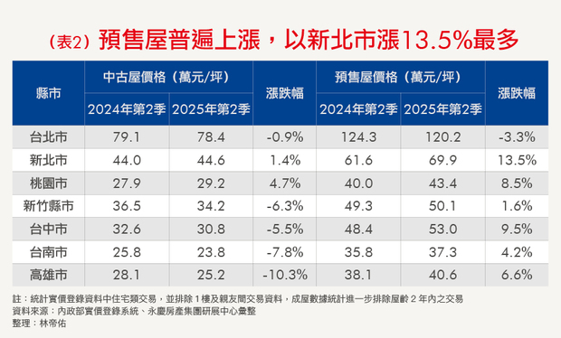 陳金萍指出,這波「價差擴大潮」主要原因在於中古屋價格修正、預售屋卻持續上漲。2025年第2季,七大都會區的中古屋,除了新北市、桃園市分別較去年同期小幅上漲1.4%、4.7%外,其餘都會區較去年同期下修0.9%至10.3%不等(詳見表2)。預售屋方面,同期間除了台北市小幅下跌3.3%外,其餘都會區均較去年同期上漲,其中,以新北市漲13.5%最多。