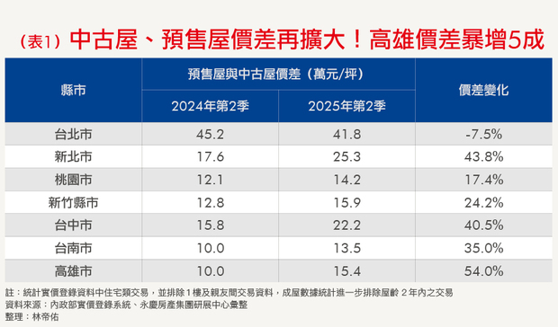台灣房市自2024年下半年起逐漸降溫,尤其在9月央行公布第7波選擇性信用管制規定後,氛圍明顯轉冷,房價也開始出現變化。為觀察政策實施前後,不同產品的價格波動,永慶房產集團研展中心統計2024年第2季與2025年第2季,中古屋與預售屋的價差變化。